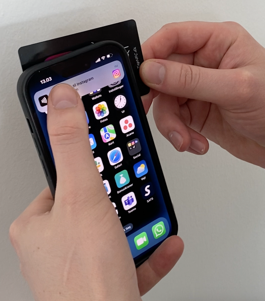 - Kortet er mobilt i den forstand at du kan række det til dine kunder, så de nemt kan holde det hen til mobilen, hvor NFC-chippen bliver aktiveret. På bagsiden af kortet er der også en QR kode, såfremt kunden ønsker at scanne QR koden med sit kamera.