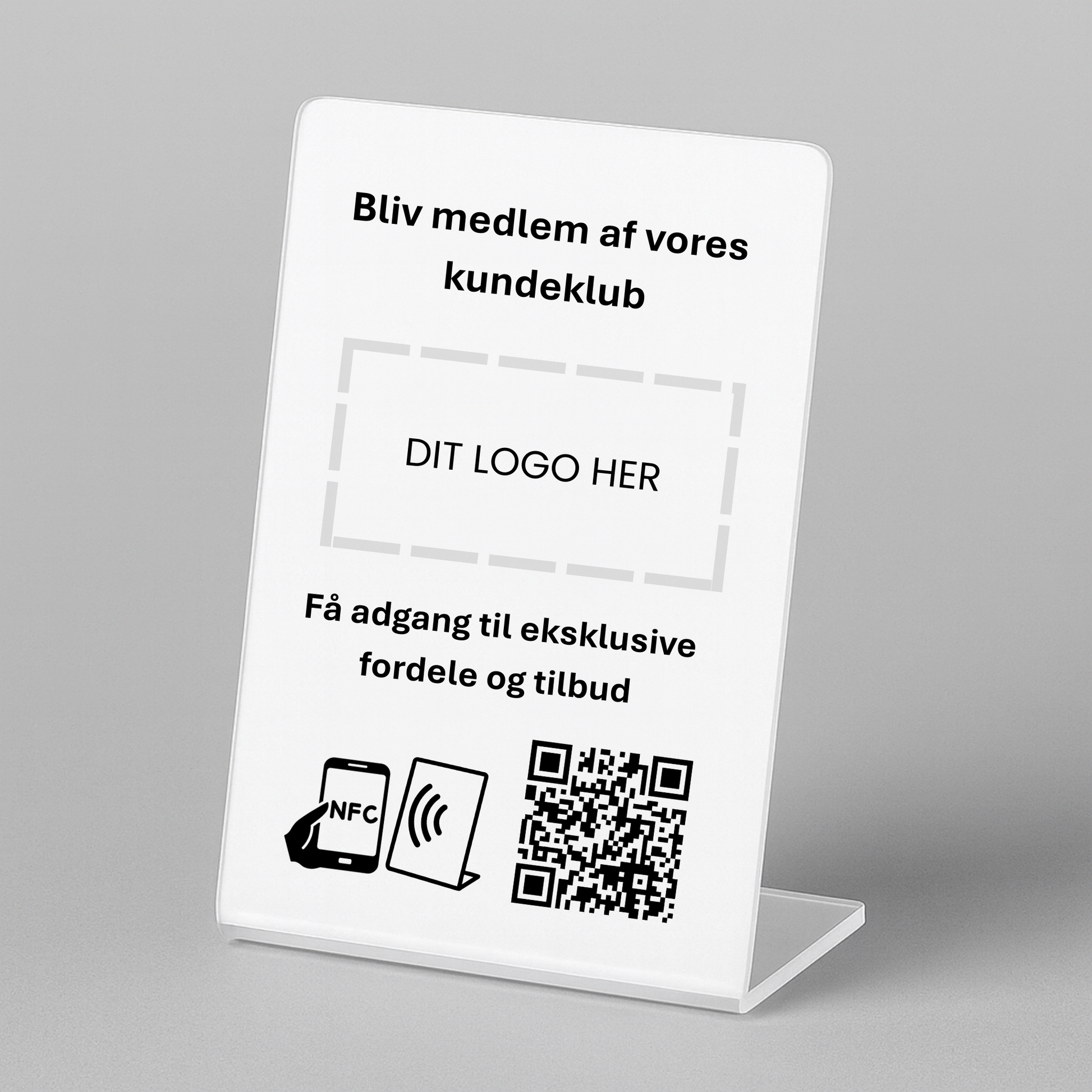 Perfekt til kassen, receptionen eller venteområdet, hvor kunderne ser bordstanderen og hurtigt kan blive en del af jeres fællesskab.